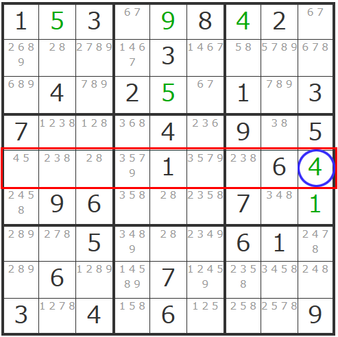 トリプル数字から離れて、この状況でもう少しいうと、先ほどの「4」の確定により、基本テクニックに立ち返って左中央ブロックの「4」も確定可能です。