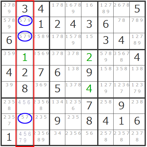 9マスブロック内には他に候補数字が3個以下のマスはないので、タテ列で追ってみましょう。