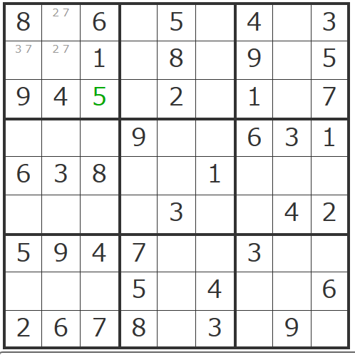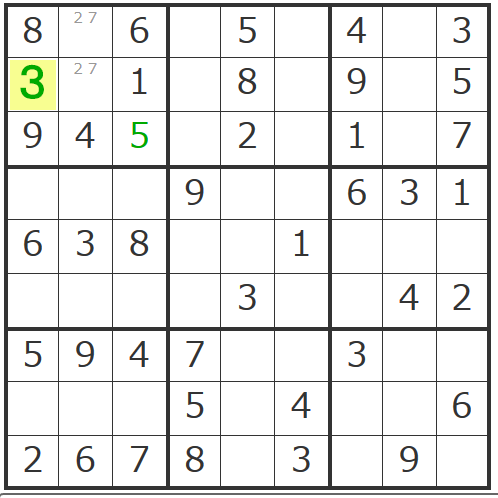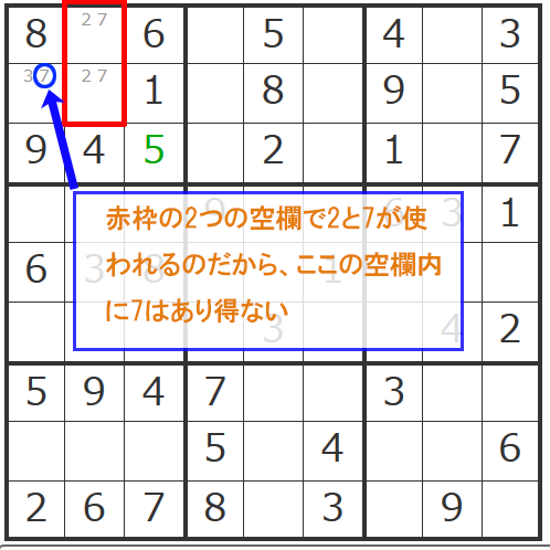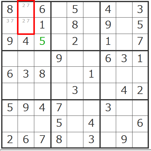 今回でいうと「27」「27」の候補を持つ2つの空欄の内、どちらかが「2」でどちらかが「7」なのです。ただしまだどちらが2なのか7なのかまでは絞りきれていない半確定な状況です。