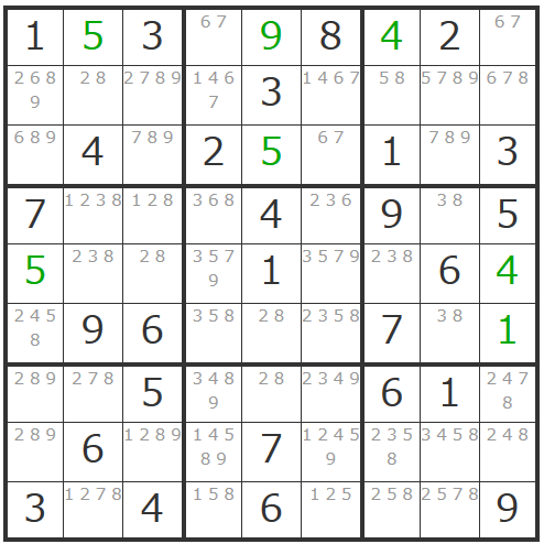 下記画像は候補数字のメモが終わり、ある程度解き進めたものです。