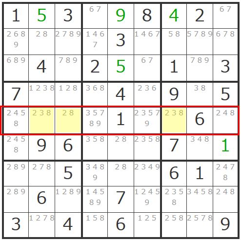 また「23」「28」「38」のような3つのマスの候補数字がすべて1つずつ削られているようなトリプル数字もありますので、見落とさないようにしましょう。