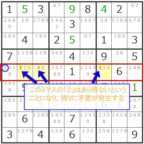 おやおや?これでは3つのマスの候補数字が2種類(「3」と「8」)になることとなり、矛盾が発生し破綻してしまいます。