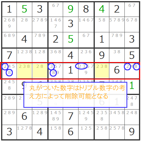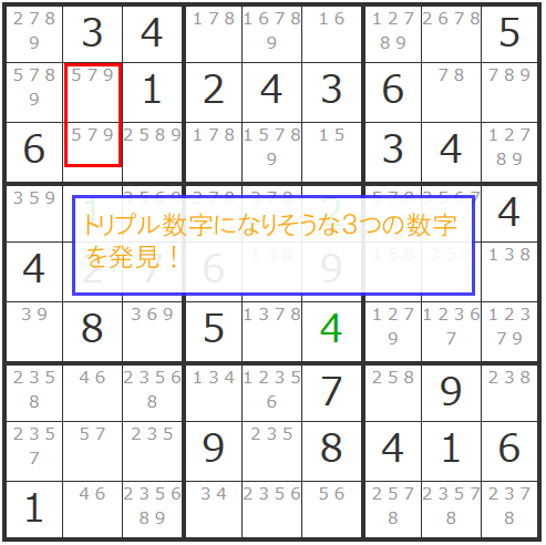 このように2つ、あるいは3つの同じ数字の候補数字のマスがあったら「トリプル数字」がないかチェックする癖がつくと見つけやすいですよ。