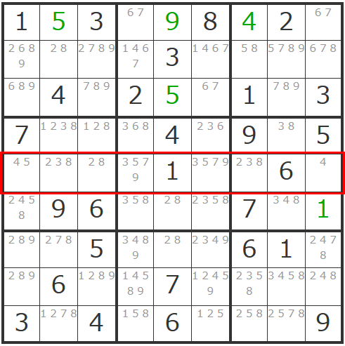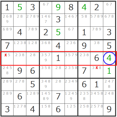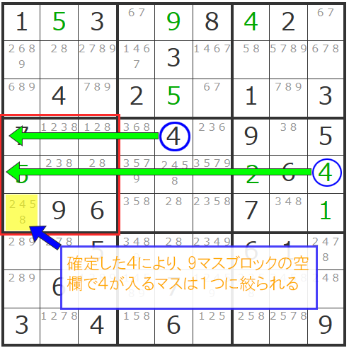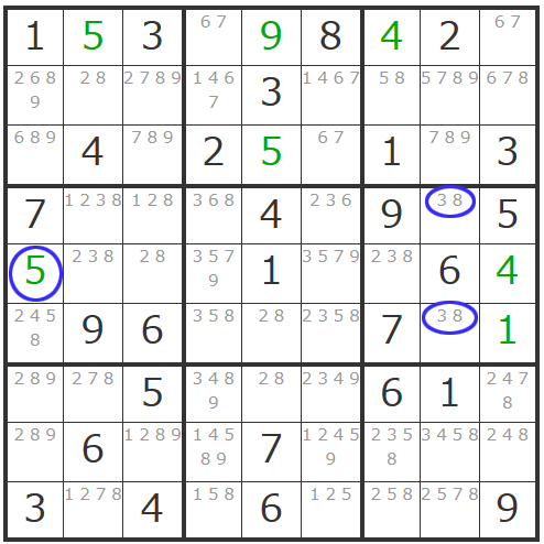 更にこの「4」の確定で影響するエリアの「4」が消えることとなり、ヨコ列の一番左のマスは「5」で確定できますし、右中央ブロックに「38」「38」の「ダブル数字」が現れて同ブロック内で「2」も確定することができます。