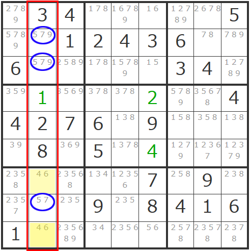 9マスブロック内には他に候補数字が3個以下のマスはないので、タテ列で追ってみましょう。
